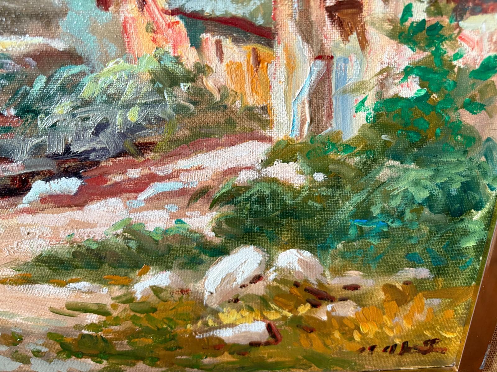 La obraes es una pintura al óleo sobre lienzo, aplicada con pinceladas sueltas y visibles. El empaste es moderado, especialmente en las zonas de luz y vegetación, lo que aporta textura y vitalidad al paisaje.