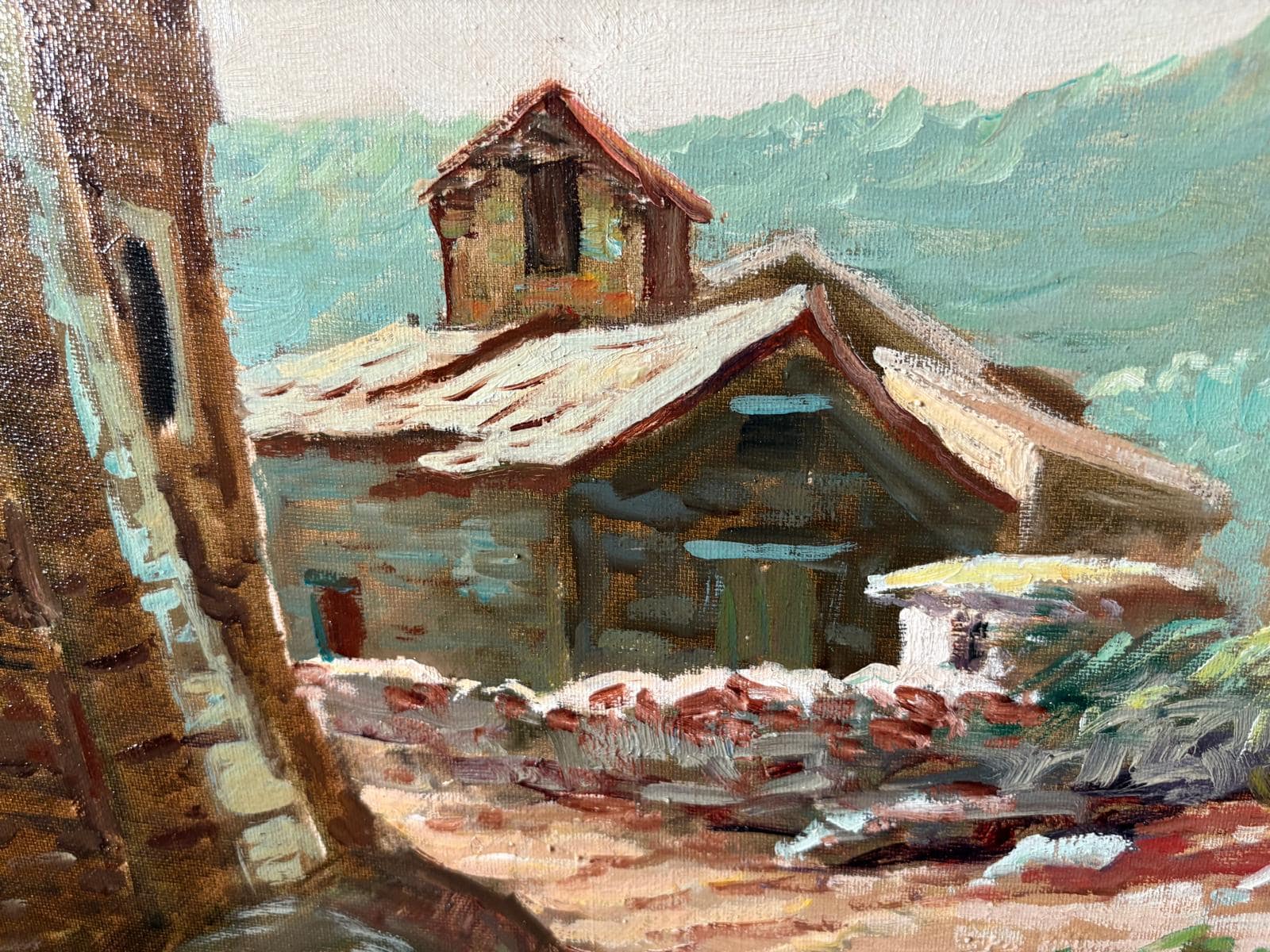 El paisaje rural transmite tranquilidad y cierto aire nostálgico. Las montañas del fondo diluyen los contornos con veladuras más suaves, lo que aporta profundidad atmosférica y un efecto de distancia.