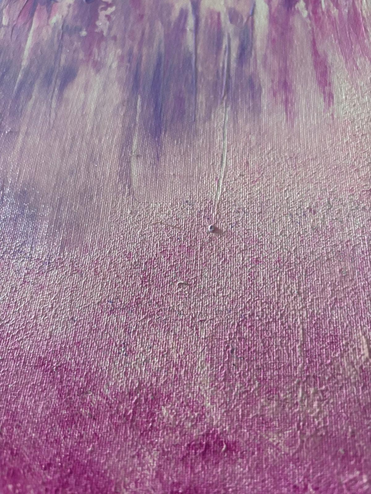 una paleta de tons pastel —rosats, blaus i liles— i una textura marcada que aporta profunditat i