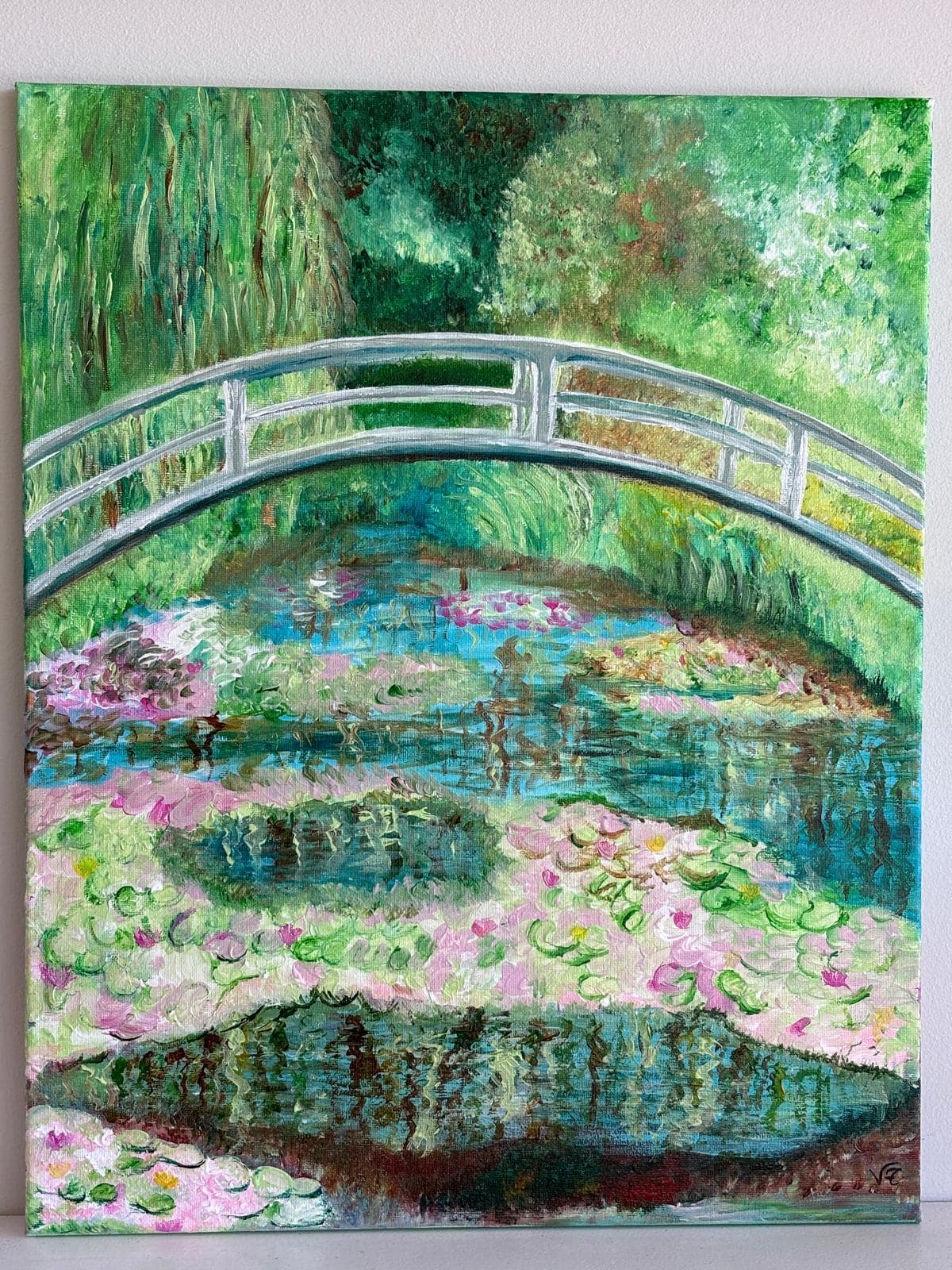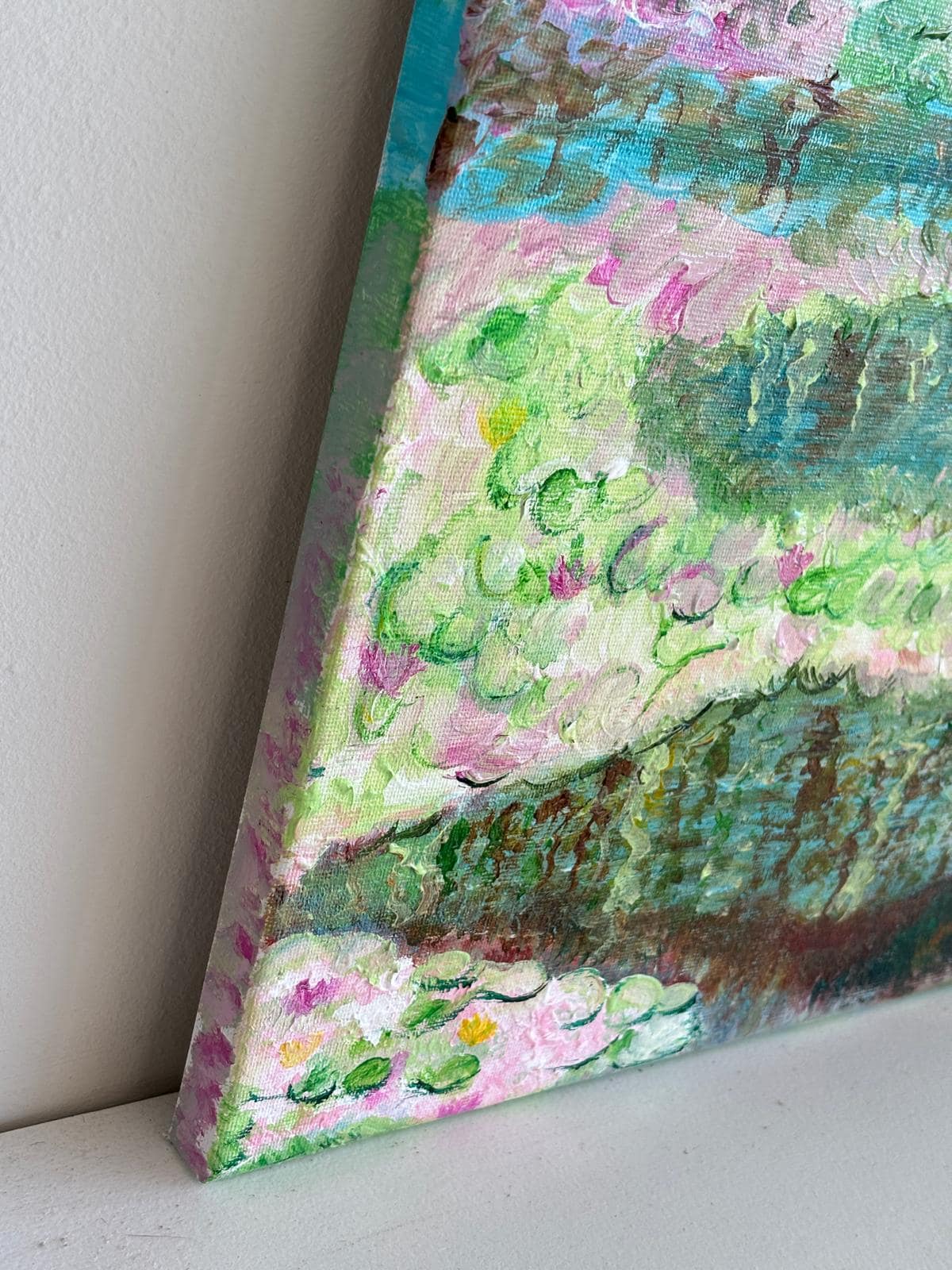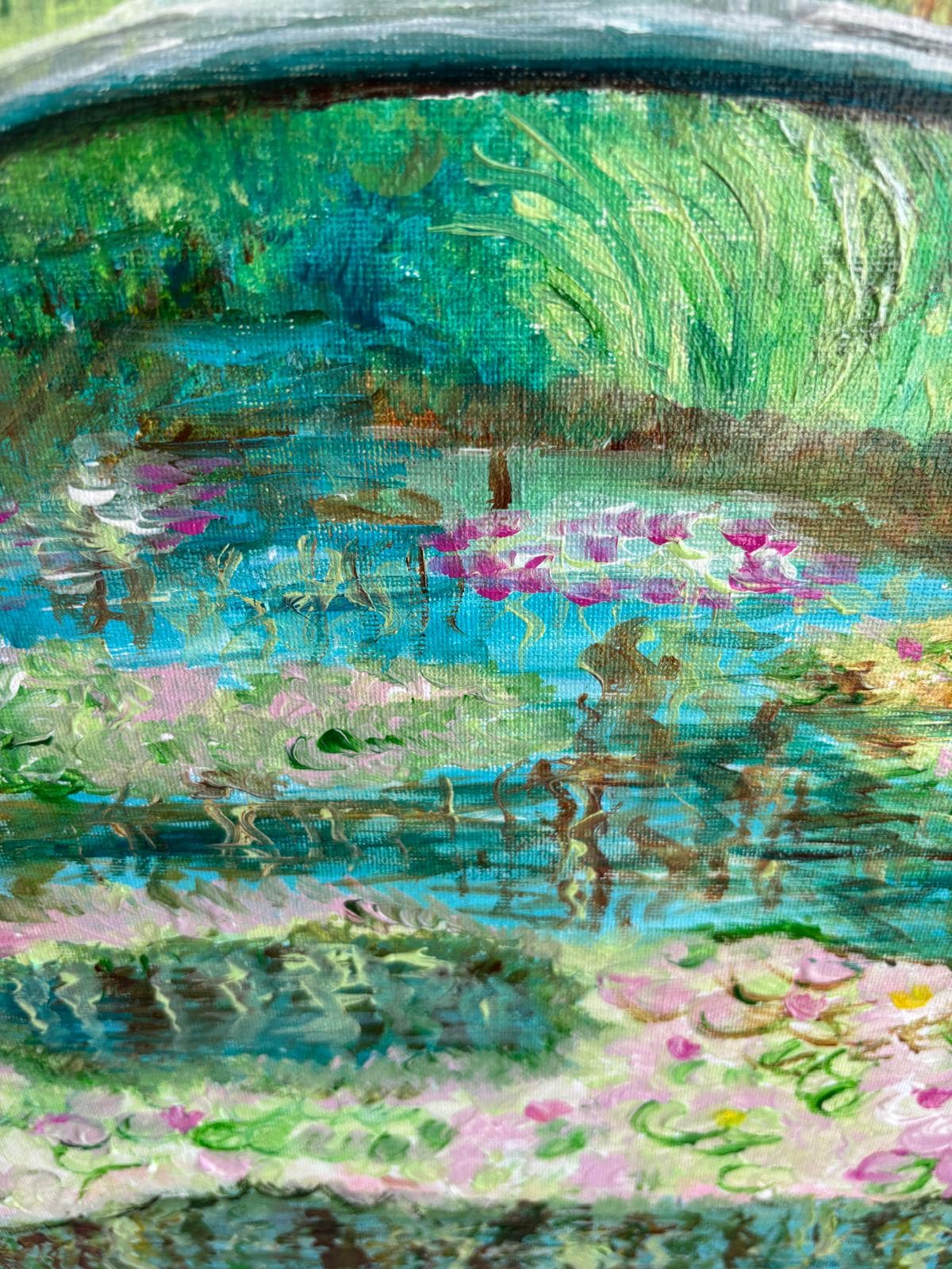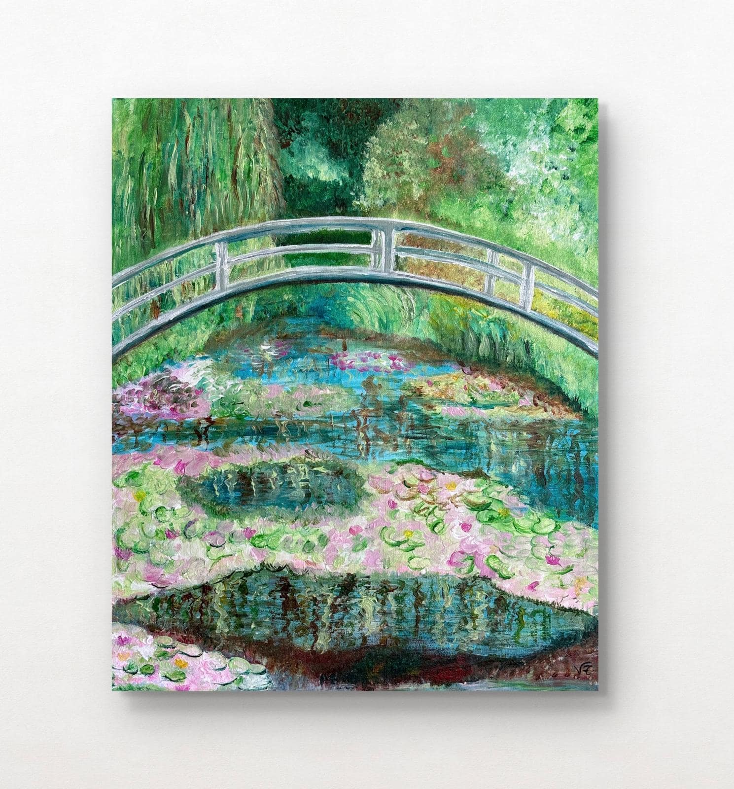 Pintura impresionista original (50 × 40 cm) que representa un puente sobre un estanque, con suaves texturas florales y reflejos luminosos.
