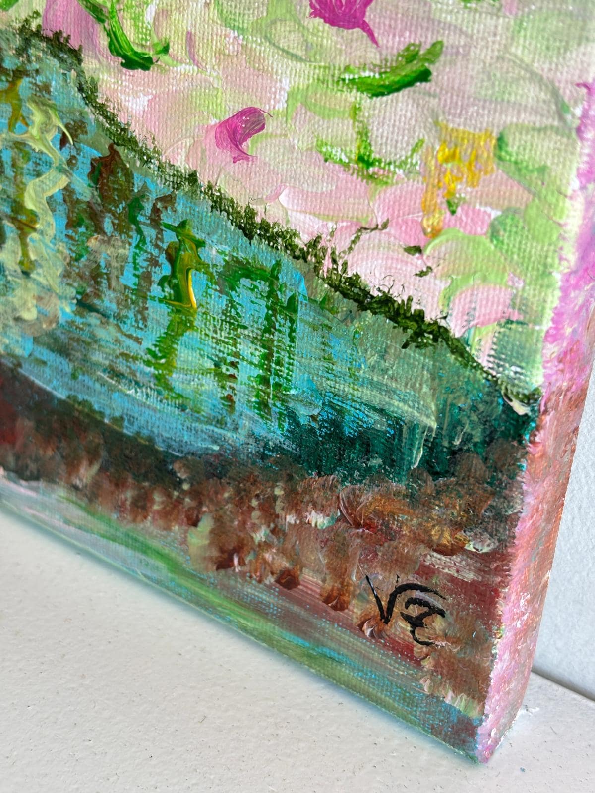Los tonos de verde, azul y rosa se combinan armoniosamente, creando una atmósfera tranquila y contemplativa inspirada en los paisajes impresionistas de Monet.