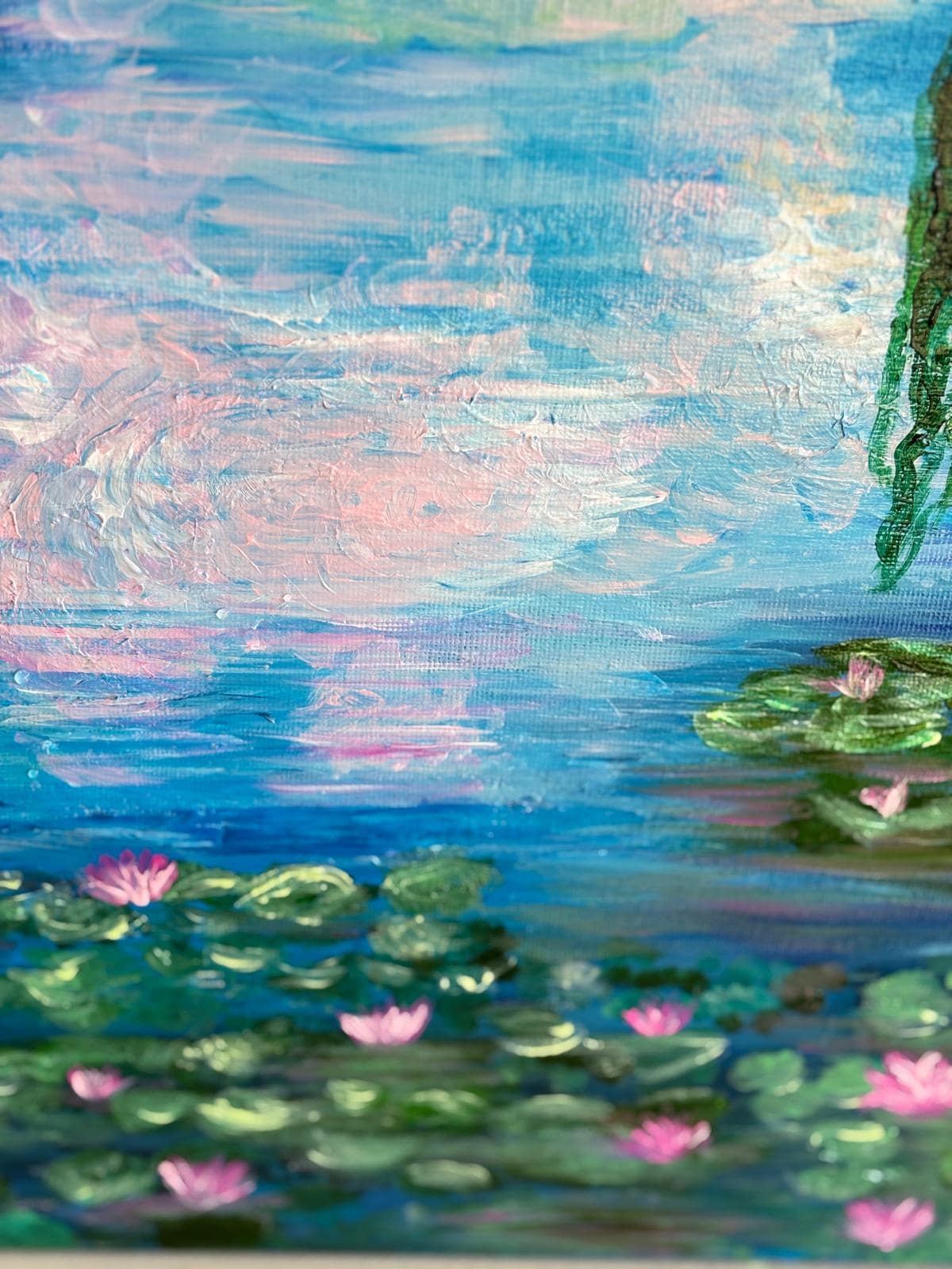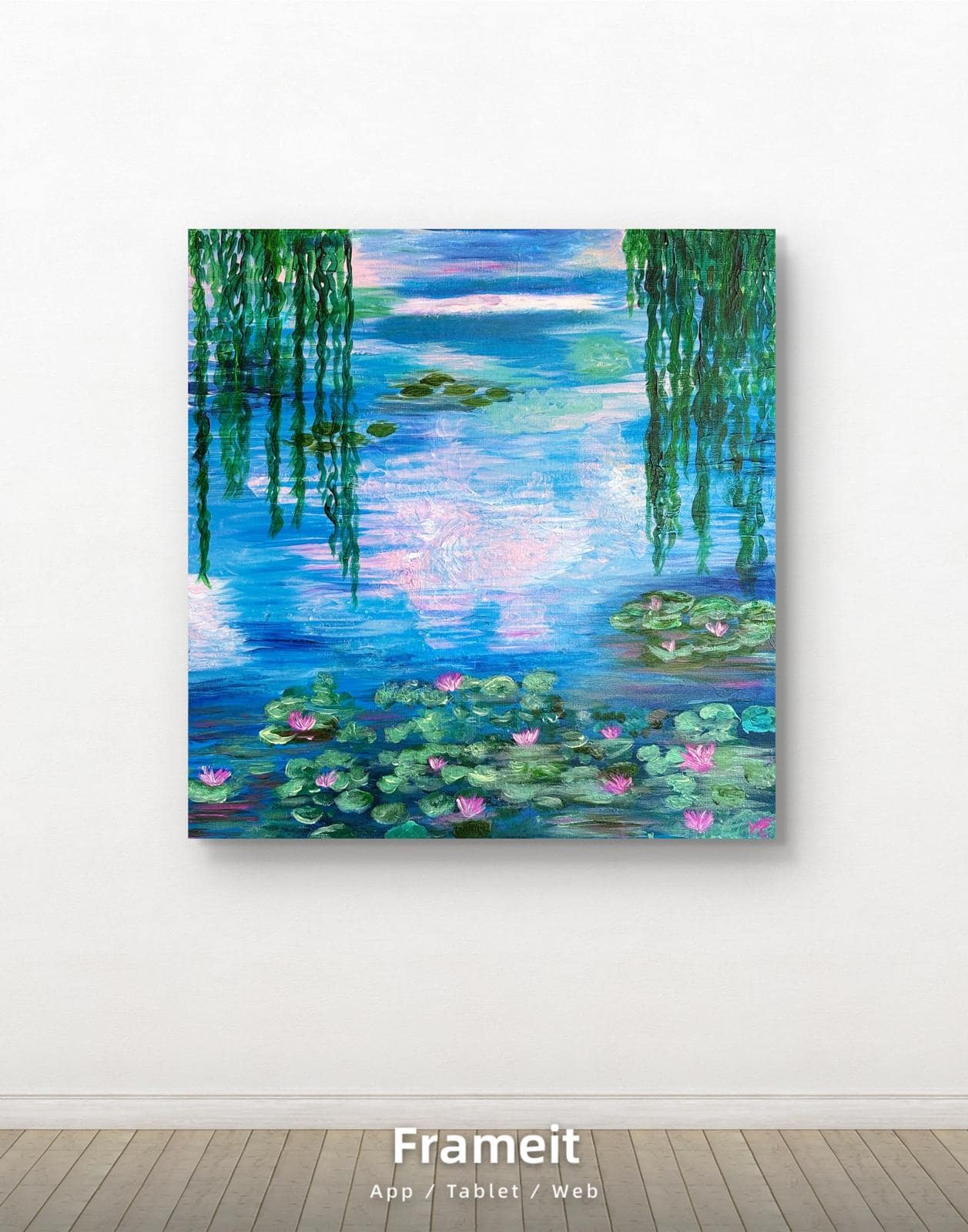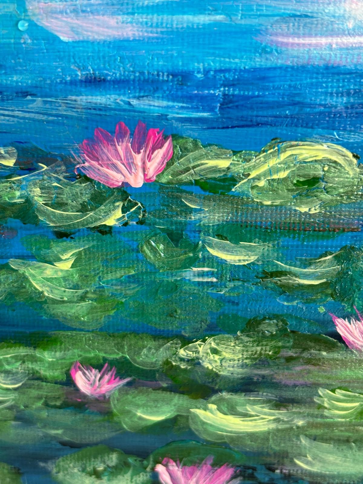 Esta pintura captura la serenidad de un momento de calma, donde el agua, la luz y los nenúfares se funden en suaves pinceladas. Inspirada en el impresionismo y pintada desde la emoción, es una obra creada para transmitir paz, equilibrio y una sensación de silencio delicado. Un pequeño refugio de luz y color, diseñado para llenar tu hogar de armonía.